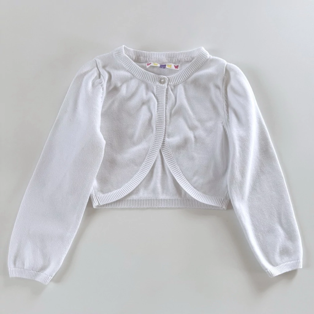 A boleró különösen jól mutat ruhácskák felett, így praktikus és stílusos kiegészítő minden kislány ruhatárában. A jobb vállánál található apró, halvány folt alig észrevehető, a kardigán ettől függetlenül kifogástalanul hordható.