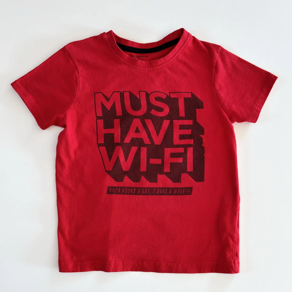 Ez az élénk piros Primark póló igazi vagány darab minden kisfiú ruhatárában. Elöl nagy, fekete „MUST HAVE WI-FI” felirat díszíti, amely modern, játékos hangulatot kölcsönöz. Anyaga 100% pamut, így kellemes tapintású, jól szellőző, és mindennapi viseléshez is kényelmes.