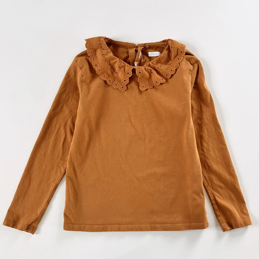 134-es Next középbarna madeira galléros pamut hosszú ujjú kislány felső – 9 év