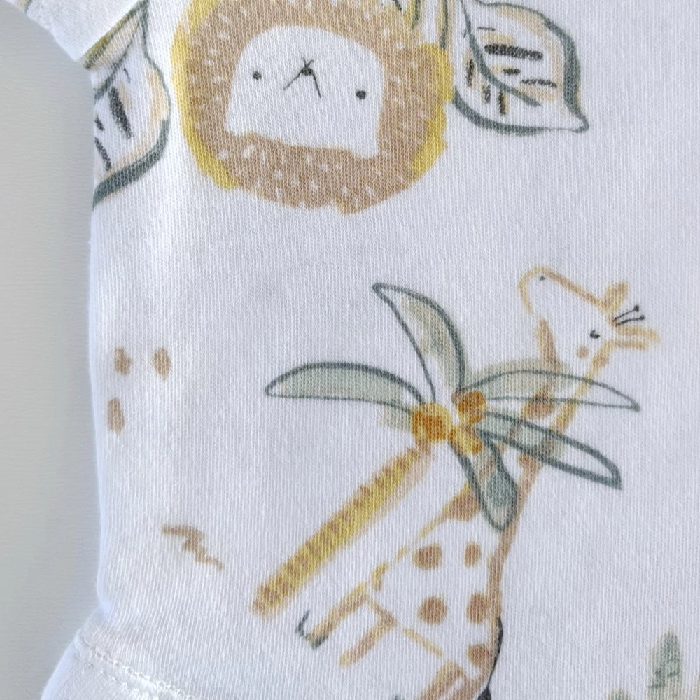 Ez a Nutmeg márkájú rövid ujjú pamut body kedves, természetközeli mintájával tökéletes választás újszülött kisfiúknak. A fehér alapon sárgásbarna és menta árnyalatú állatminták (oroszlán, zsiráf, pálmafa) vidám, mégis letisztult megjelenést adnak.