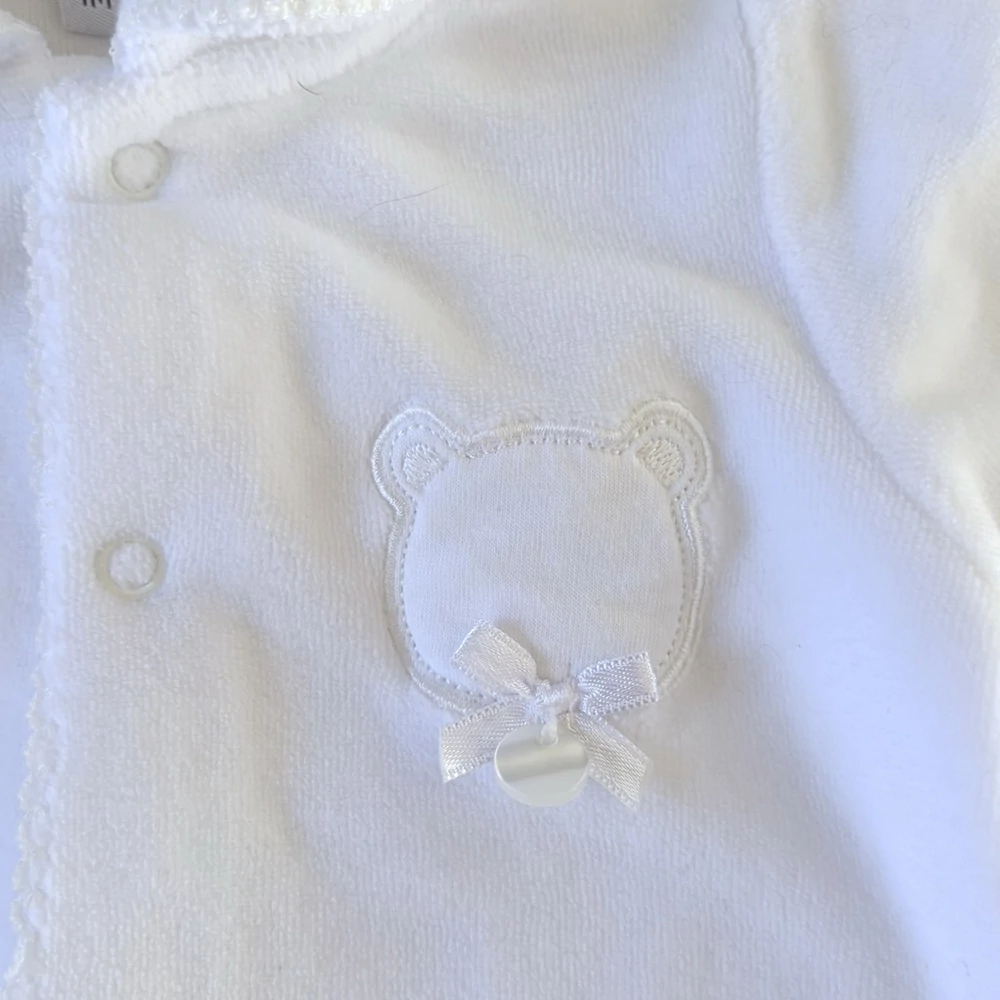 A finom medvés hímzés és masnis díszítés letisztult, visszafogott stílust ad a ruhának. Az elöl végig patentos kialakítás megkönnyíti az öltöztetést, a lábfejes szabás pedig extra meleget biztosít.