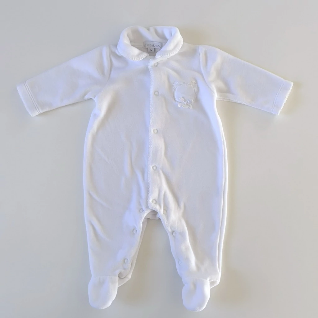 Ez a Blues Baby márkájú, fehér plüss rugdalózó elegáns, mégis kényelmes viselet újszülött babáknak. Puha, prémium minőségű anyaga 76% pamut és 24% poliészter, amely melegen tartja a kicsit, miközben gyengéd a bőrhöz.