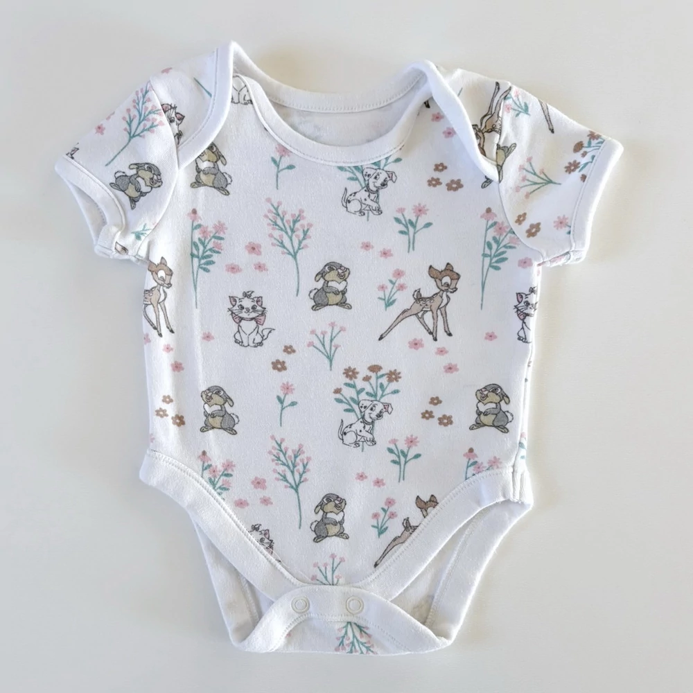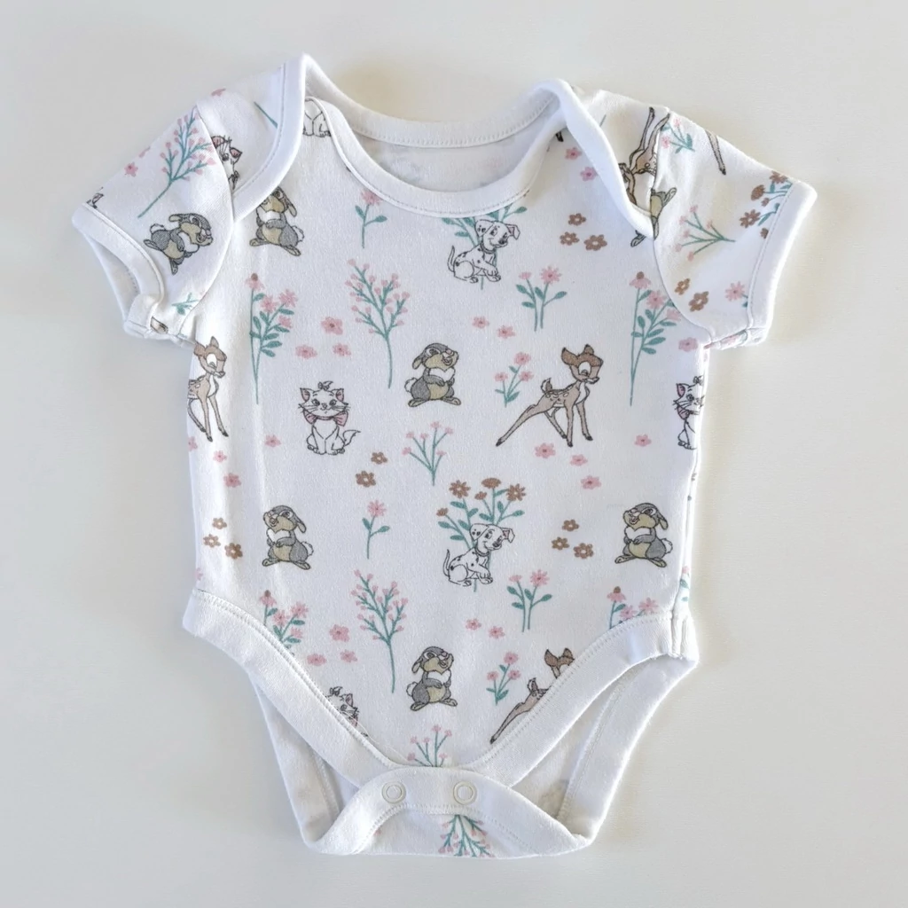 Ez a bájos, Disney mintás rövid ujjú pamut body tökéletes választás minden kislány számára. A fehér alapon finom pasztell színekkel megjelenő mesefigurák – Bambi, a kis őzike, Tappancs, a vidám nyuszi, Marie cica az Arisztokattákból, valamint Perdita, a 101 kiskutya egyik mamája – kedves és klasszikus megjelenést kölcsönöznek ennek a babaruhának.