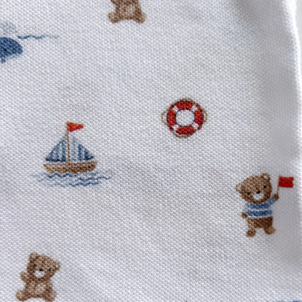 Ez a Nutmeg márkájú, 100% pamut piké póló kisfiúknak igazi nyári alapdarab. A fehér alapszínű anyagot aranyos tengerész minták – kis hajók, világítótornyok, mackók és mentőkarikák – díszítik, melyek játékos, mégis klasszikus megjelenést kölcsönöznek.