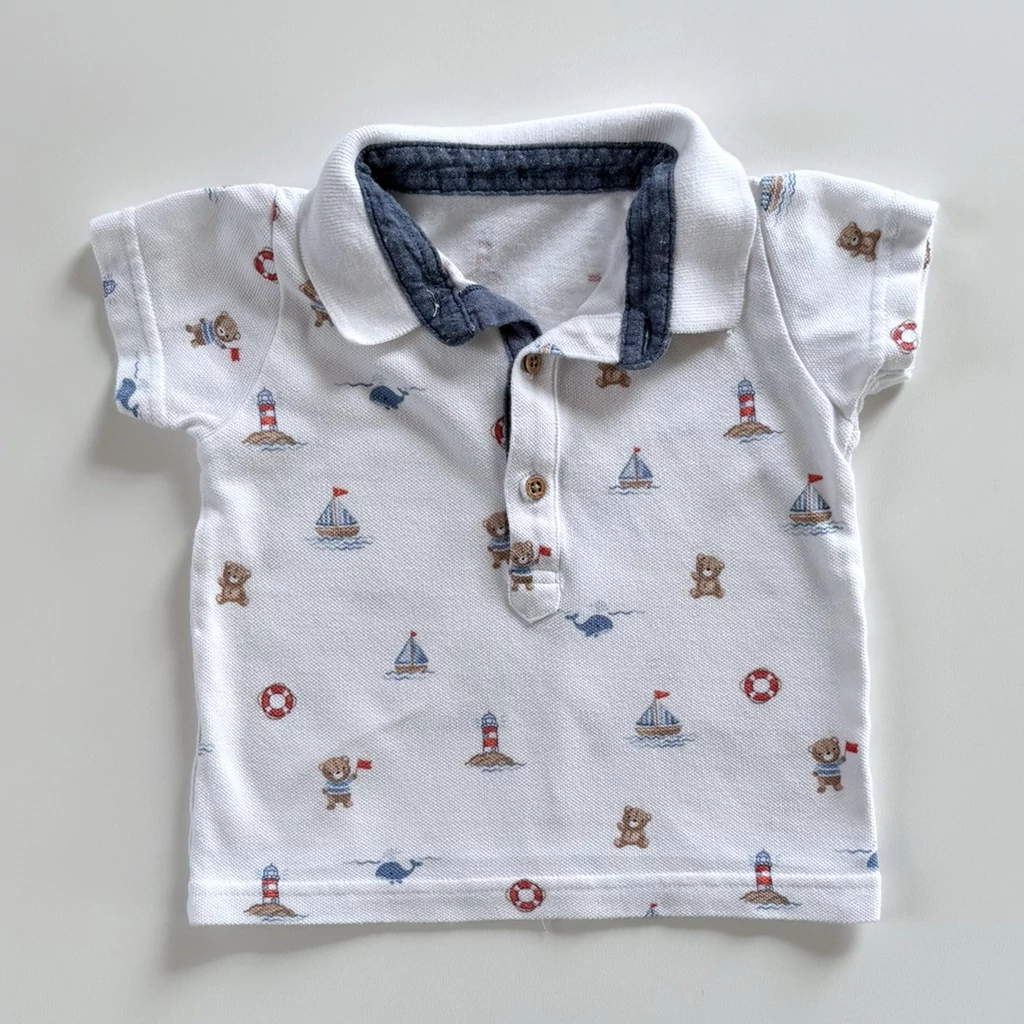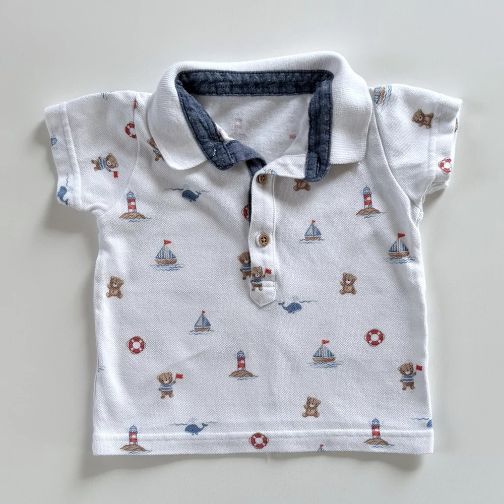 74-es fehér tengerész mintás pamut piké póló kisfiúnak – Nutmeg, 6–9 hó
