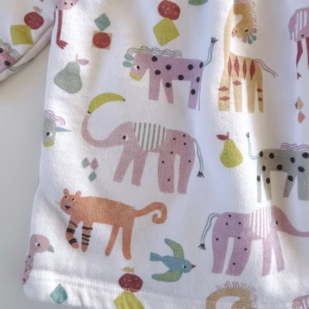 Ez az állatmintás George pamut pulóver ruha a kényelmes és játékos öltözködés tökéletes példája. A fehér alapszínű, színes állatos minta (elefánt, zsiráf, macska, madárka) kedves, gyerekszobai hangulatot idéz.