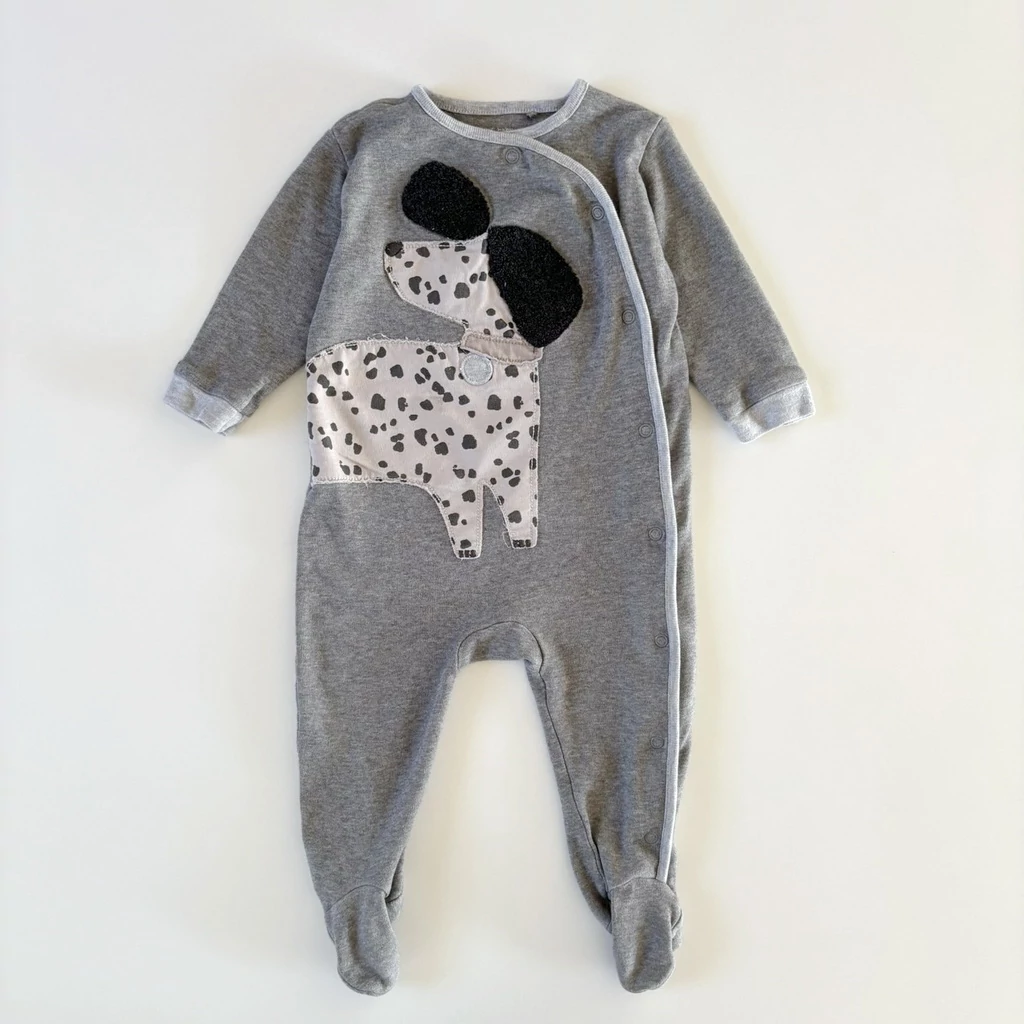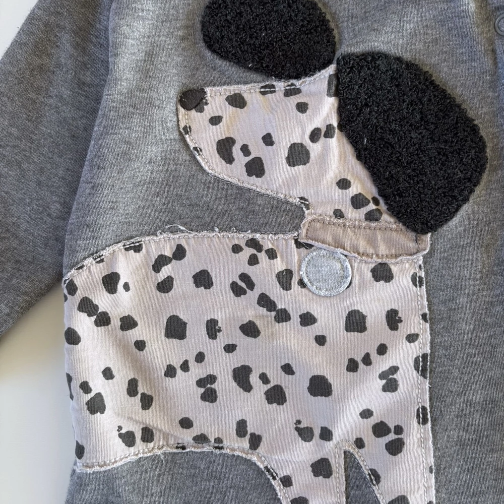 Ez a Next márkájú, kutyás pamut rugdalózó igazi kedvenc lehet minden kisfiú számára. A szürke alapon elhelyezett nagyméretű kutyás minta játékos és bájos megjelenést ad a ruhának. A fekete plüss fülrész különleges tapintást nyújt, amit a babák imádnak megérinteni.