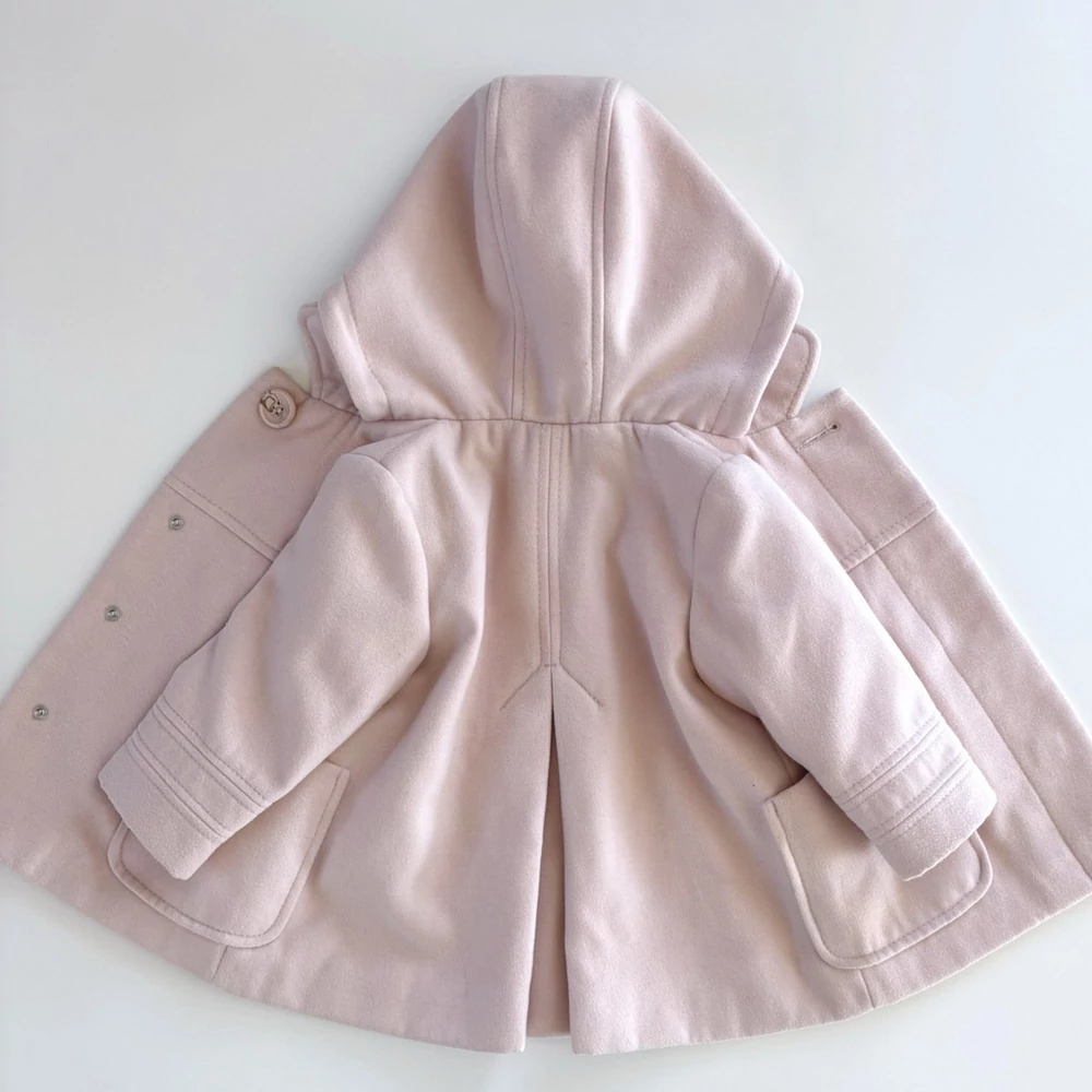 A világos rózsaszín külső eleganciát sugall, míg a motoros Vespa mintás belső bélés egyedi, játékos megjelenést kölcsönöz neki. A kabát kapucnival, egy gombbal és három rejtett patenttal záródik elöl, így a hideg szél ellen is jól véd.