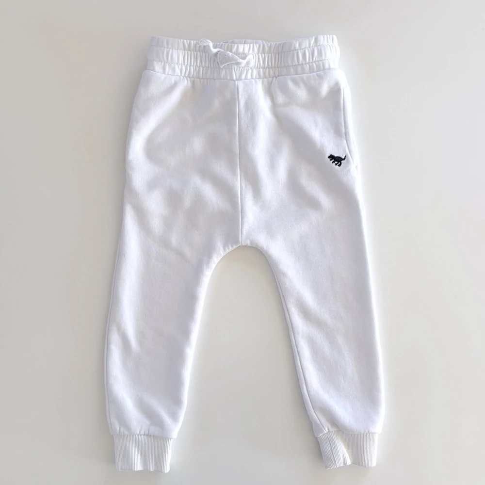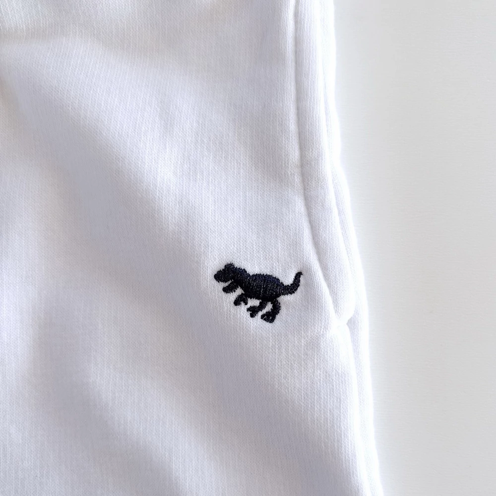 A gumis, megkötős derékrész jól tart, mégis kényelmes, a bokánál lévő passzé pedig biztosítja, hogy a nadrág ne csússzon fel játék közben sem. Az egyszerű fehér színt egy apró, hímzett dinoszaurusz díszíti – visszafogott, mégis játékos részlet, amely feldobja az összhatást.